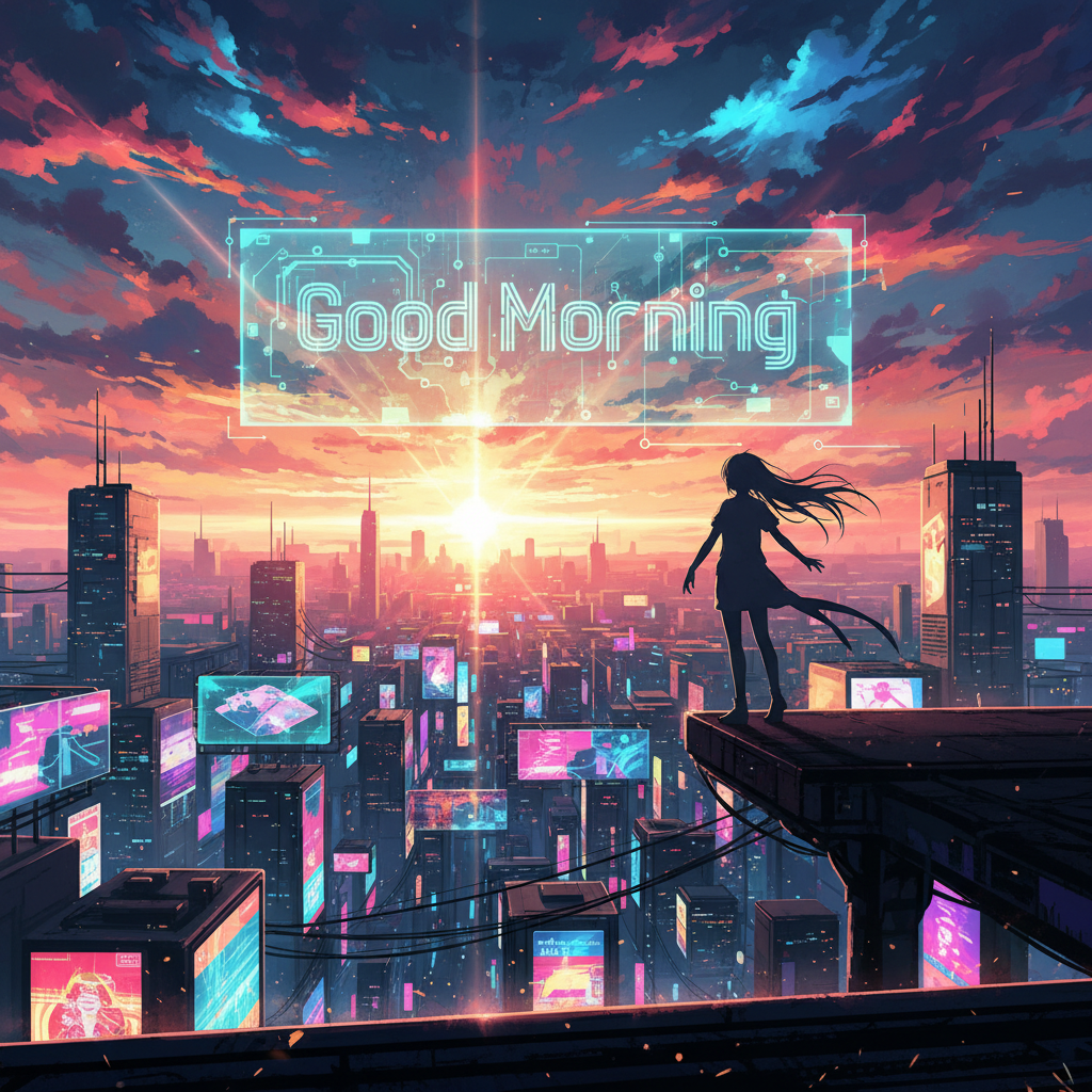 Good Morning Futuristic City Sunrise Art | Neon Sci Fi Cityscape Illustration