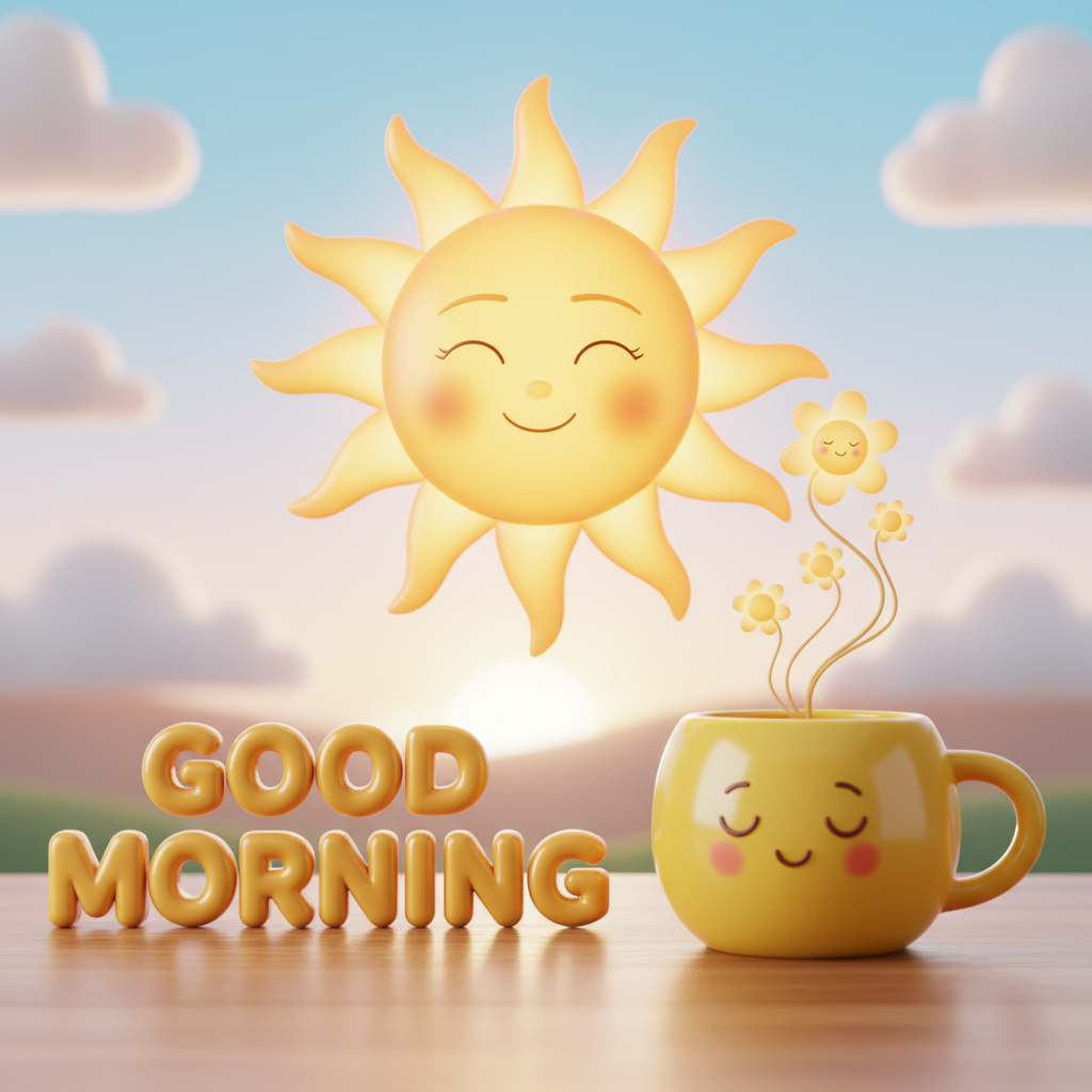 Cute Good Morning Illustration with Smiling Sun & Coffee | AI Generated