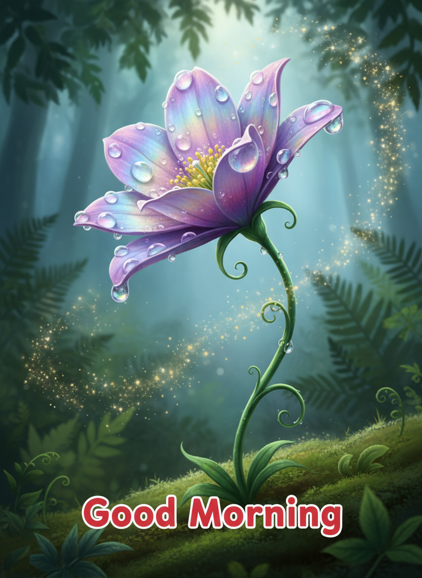 Good Morning Magical Purple Flower with Dew Drops – Enchanting Greeting Image