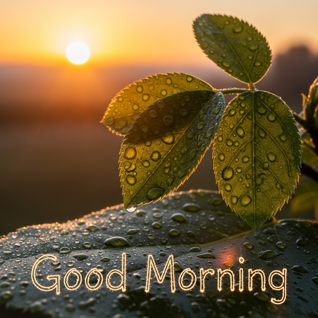 Good Morning Nature Image with Dewy Leaves at Sunrise