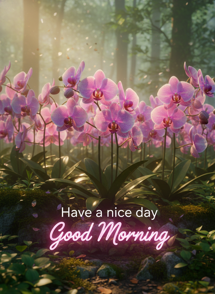 Good Morning Pink Orchids in Misty Forest: Inspirational Greeting Image