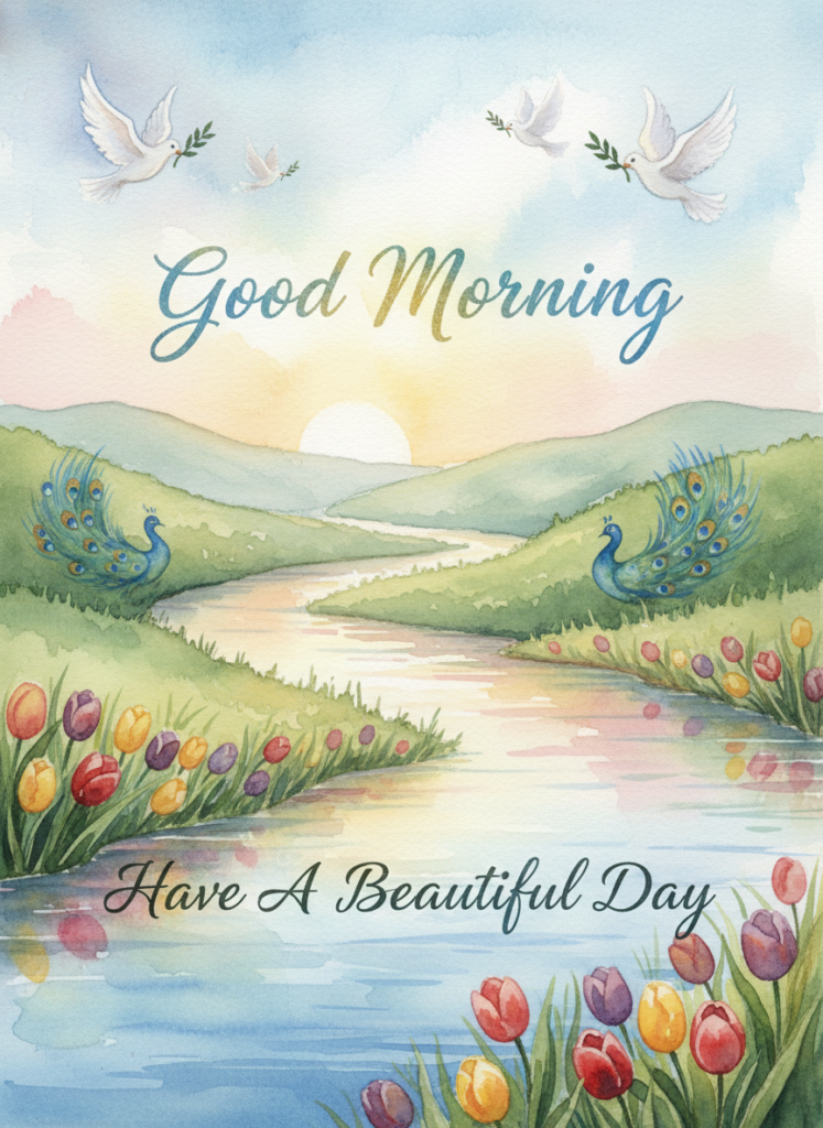 Good Morning Watercolor Landscape with Peacocks, Doves & Tulips – Have a Beautiful Day Greeting