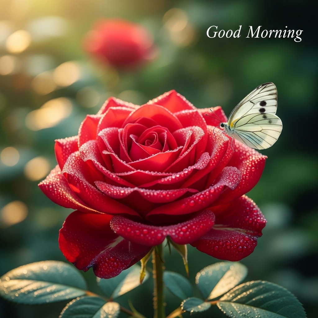 Good Morning Red Rose With Butterfly | Morning Nature Image