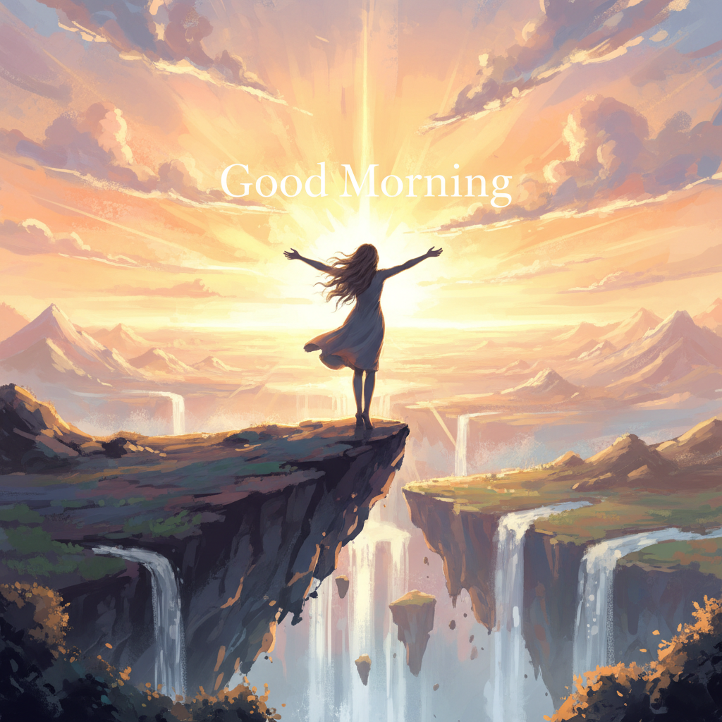 Good Morning Inspirational Sunrise Art: Woman Embracing Dawn on Cliff