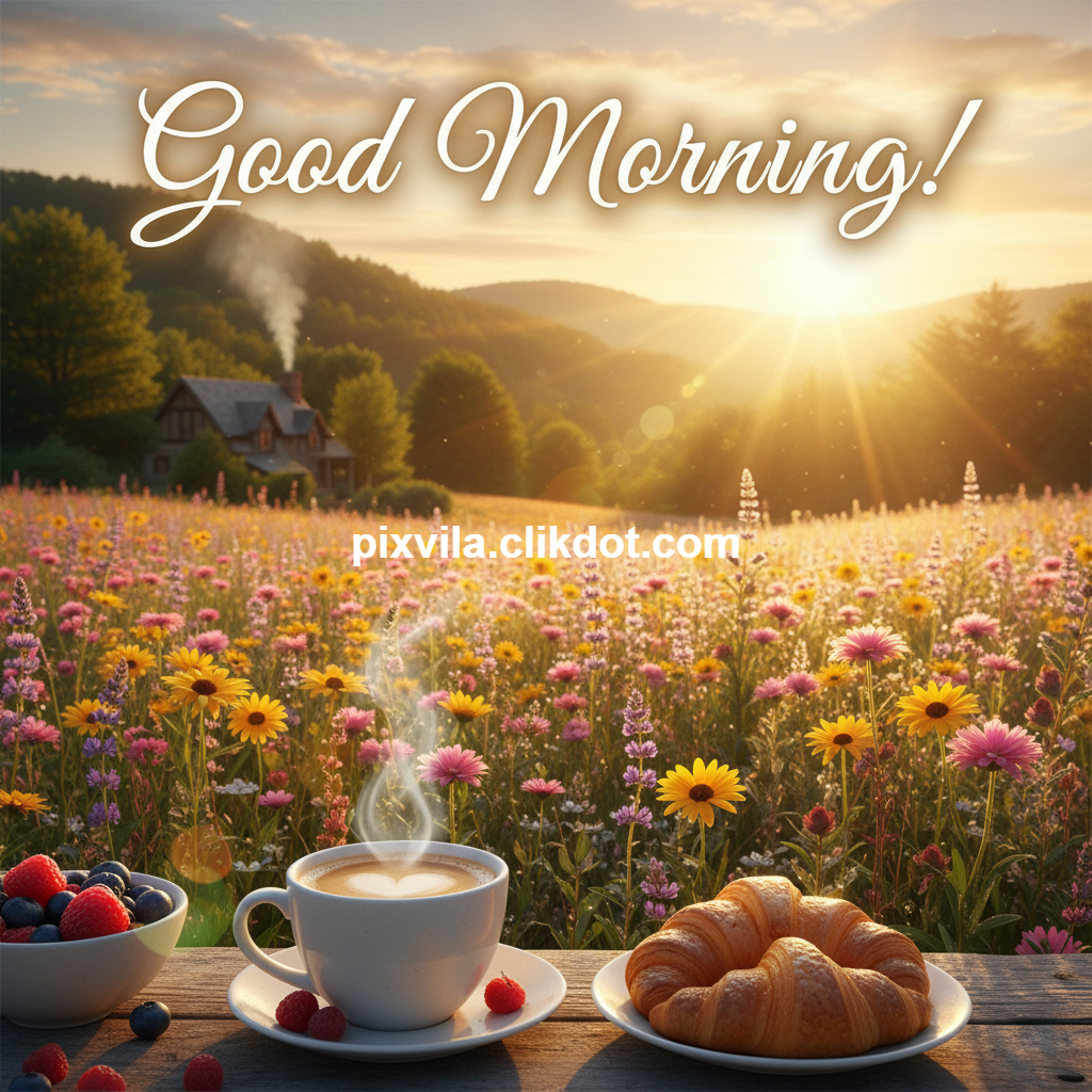 Good Morning Greeting with Coffee, Croissant and Sunrise Flowers