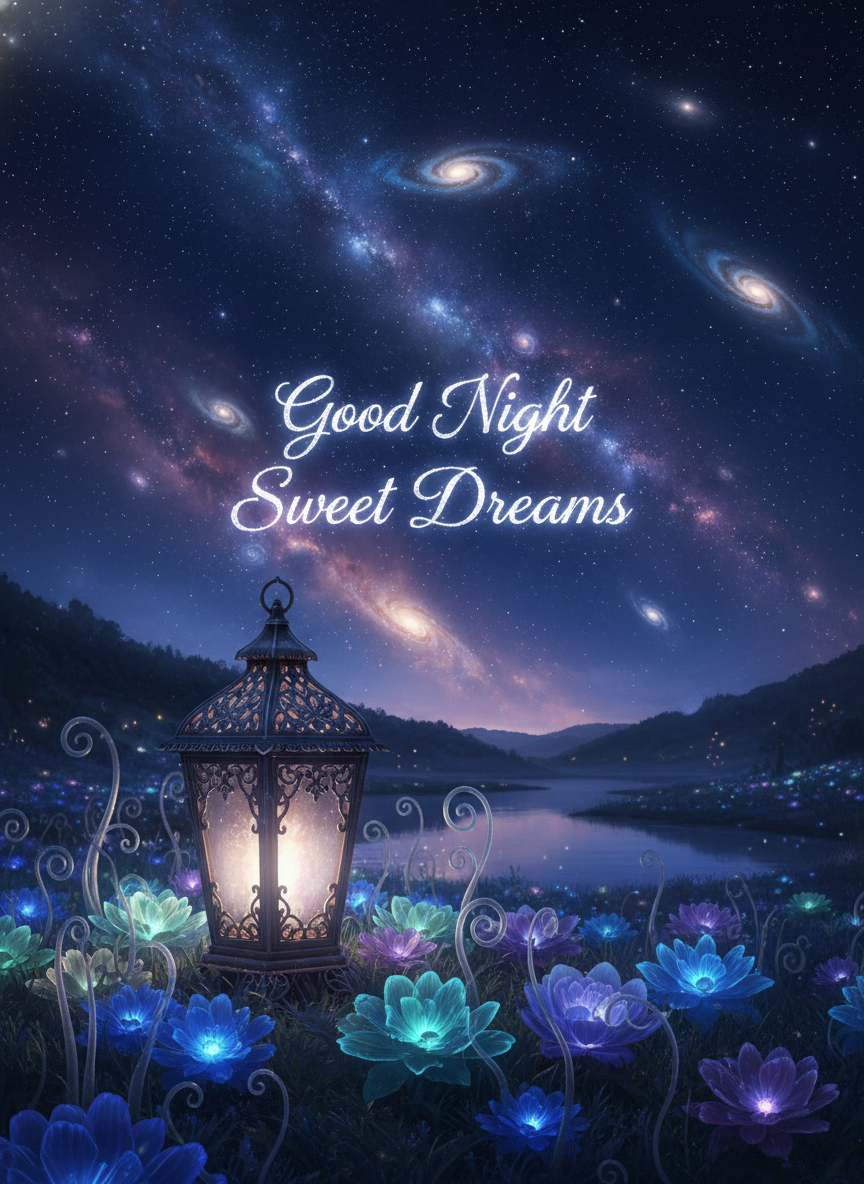 Good Night Sweet Dreams – Fantasy Galaxy Night Sky with Glowing Lantern and Magical Flowers