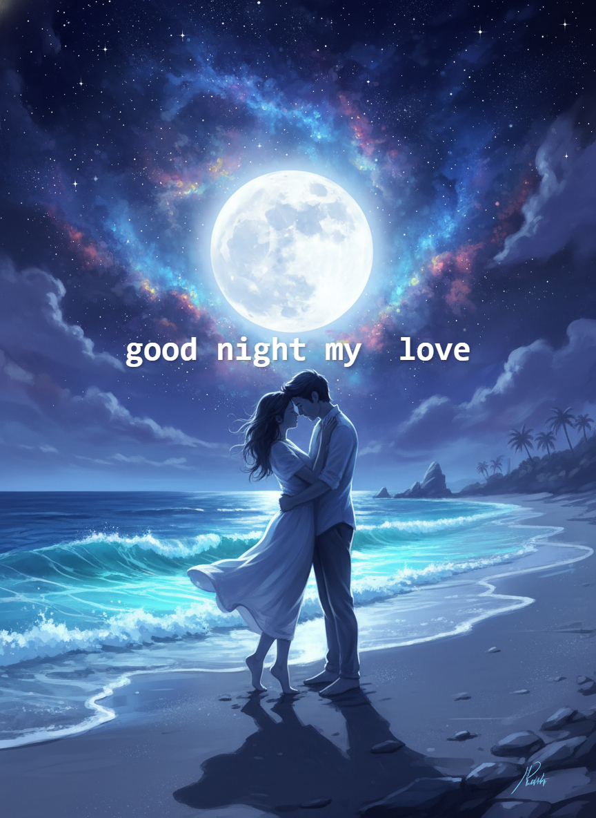 Good Night My Love: Romantic Beach Moonlight Couple Embrace
