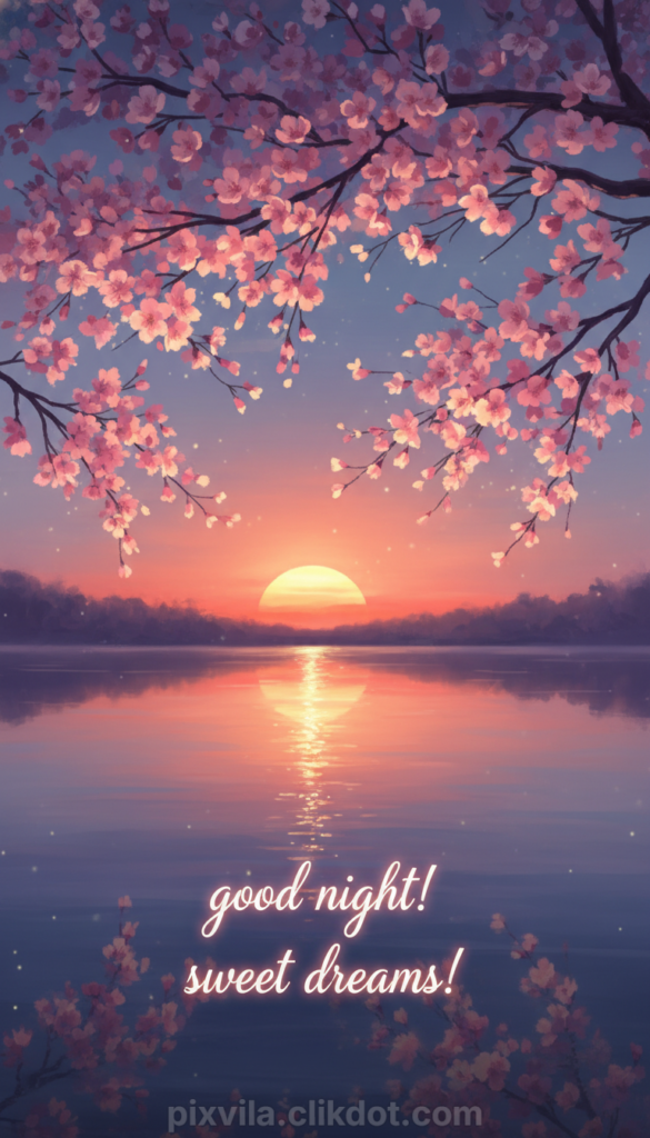Good Night Sweet Dreams Cherry Blossom Sunset | Serene Lake View