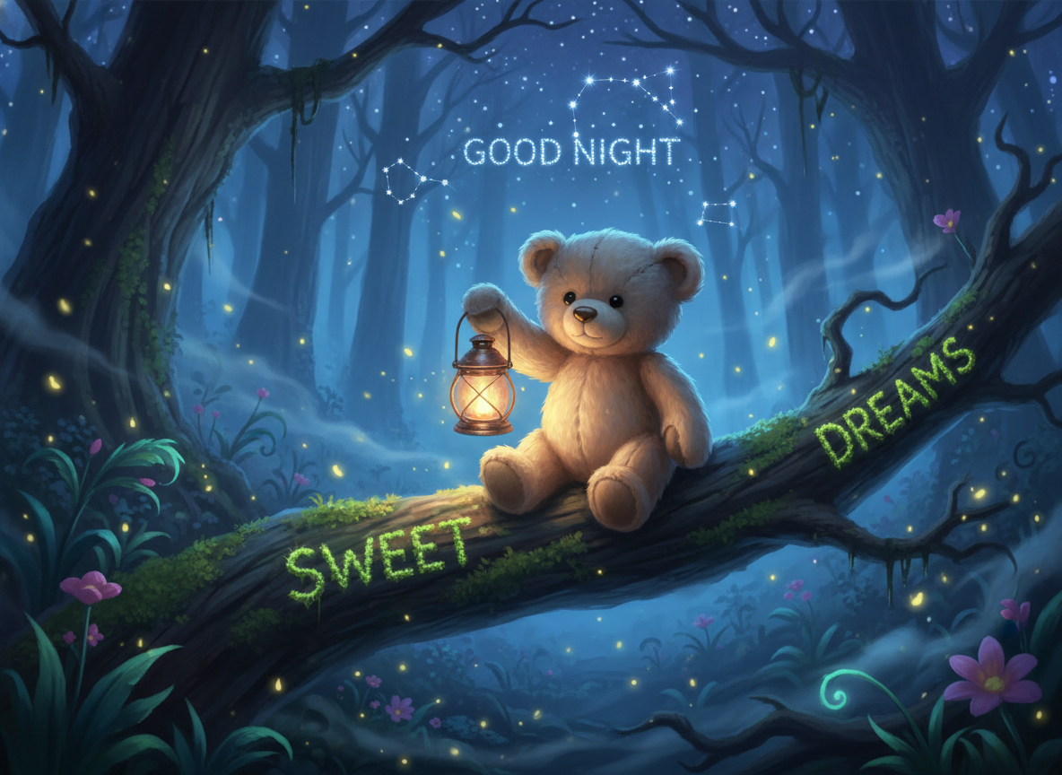 Good Night Sweet Dreams: Adorable Bear with Magical Lantern in Forest