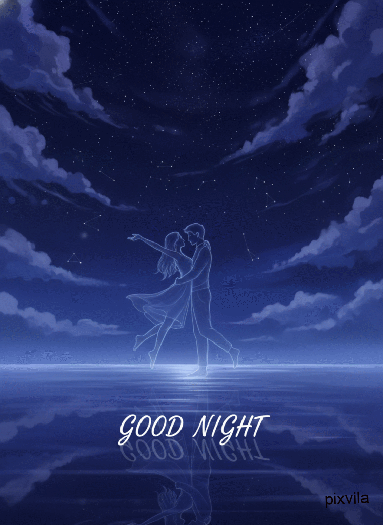 Good Night Wishes: Romantic Couple Silhouette by Water at Sunset