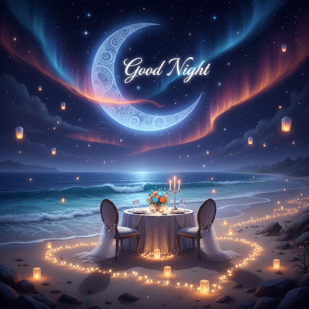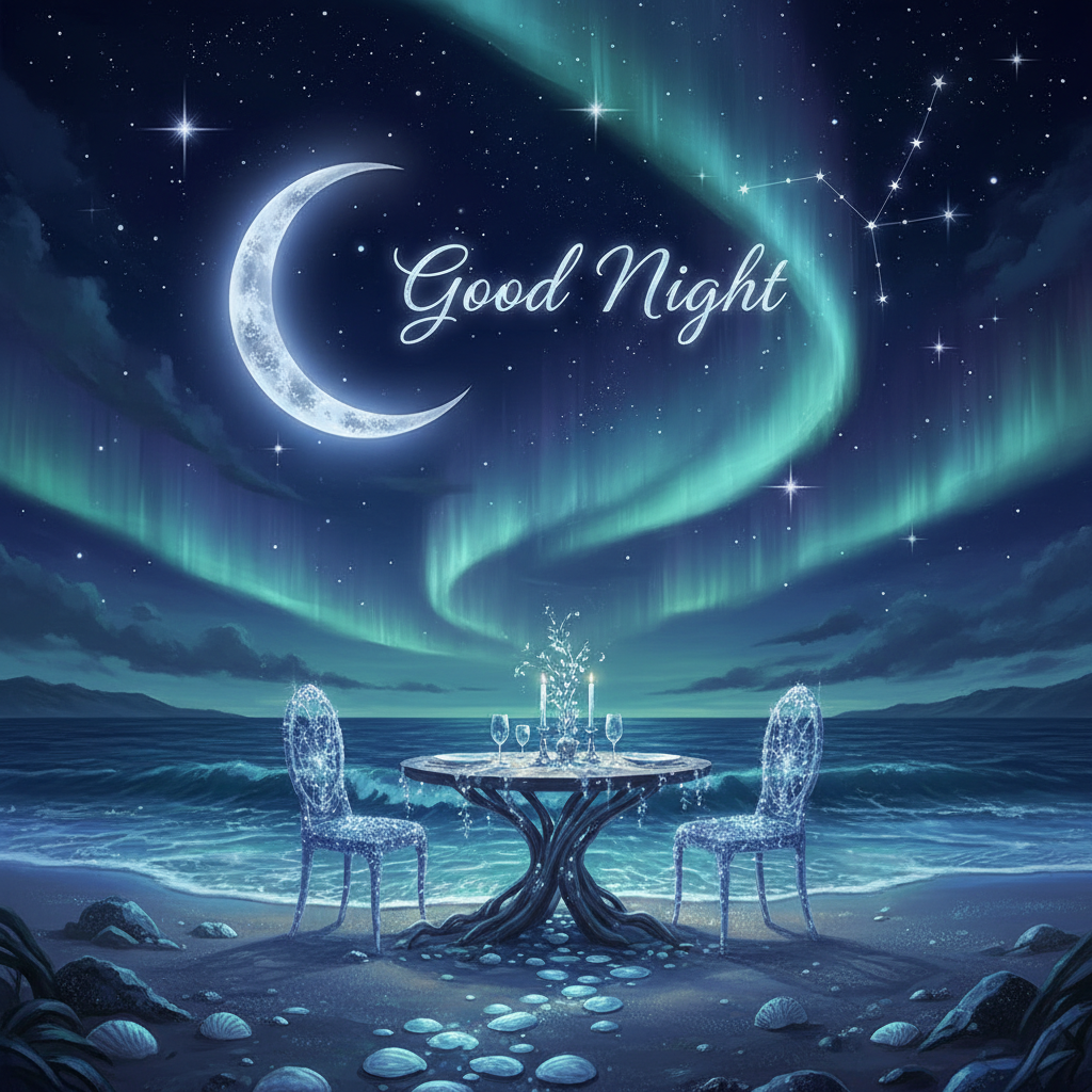 Romantic Good Night Beach Dinner Under Moon & Aurora Lights