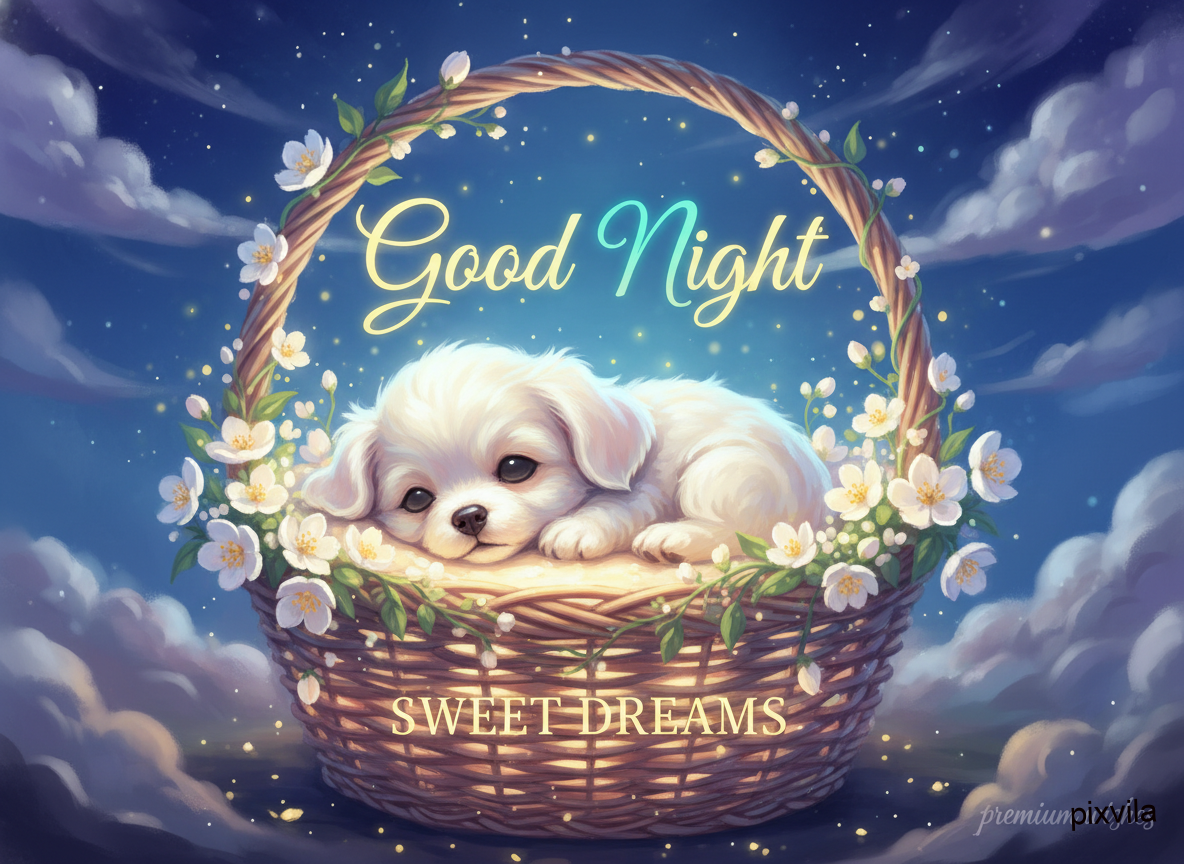 Good Night Wishes: Adorable Puppy in Basket with Flowers for Sweet Dreams