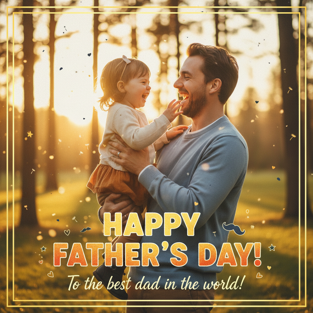 Happy Father’s Day Greeting: Father and Daughter Joyful Moment in Sunset Forest