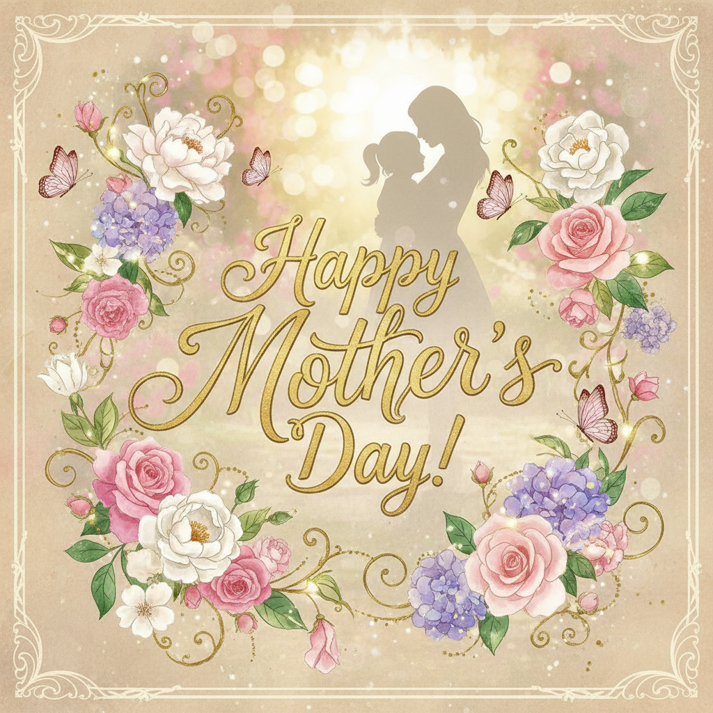 Happy Mother’s Day Greeting Card with Floral Silhouette and Butterflies