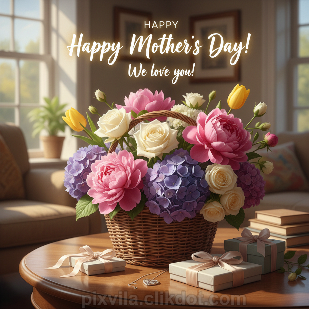 Happy Mother’s Day Flower Basket with Peonies, Roses & Gifts | Free Download