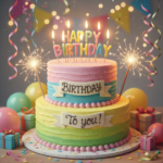 A cheerful two-tier rainbow birthday cake with pastel pink, blue, yellow, and green frosting, topped with lit “HAPPY BIRTHDAY” letter candles and glowing sparklers, surrounded by balloons, gifts, streamers, and confetti on a festive background.