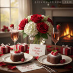 Romantic Valentine's Day dinner table with chocolate fondant cakes topped with raspberries and powdered sugar, bouquet of red roses and white flowers, champagne glasses with strawberries, gift boxes, rose petals, and fireplace glow – free AI image