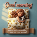 Cute 3D figurine-style good morning scene: young girl with long hair sleeping peacefully hugging black-and-white cat in polka-dot bed, gold "Good morning" cookie text above, brown ribbon banner below saying "It's time to hop out of bed and put your sassy on!", teal background with soft light