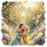 Smiling mother in blue dress hugging laughing daughter in yellow outfit holding bouquet, surrounded by flowers and butterflies with golden Happy Mother’s Day text